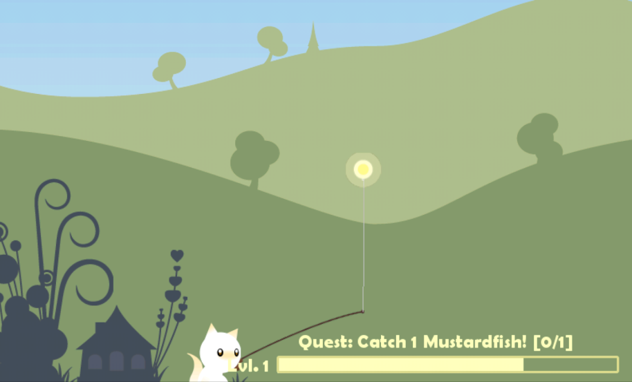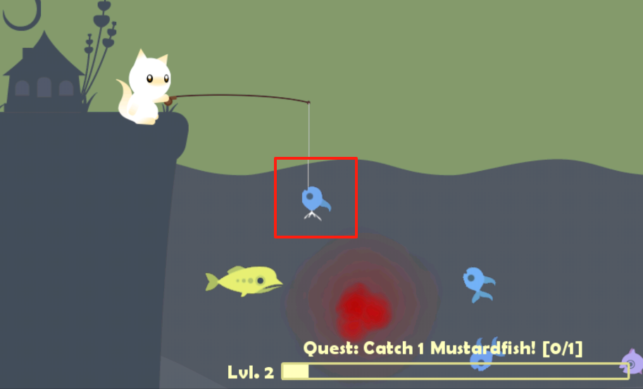 1、打开小猫钓鱼游戏,通过滑动手机屏幕,把鱼钩抛进水中钓鱼;(如果鱼钩没有抛进海里,那就多试几次)
