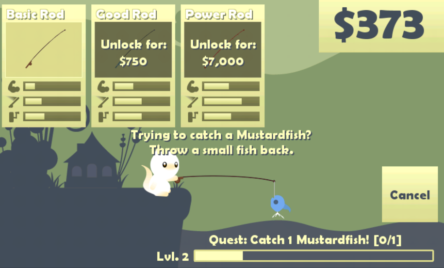 5、获得一定的金币后,你可以购买渔具,点击左上角的【渔具】按钮即可,这样你的鱼钩能抛到更远的地方,钓到更多的鱼