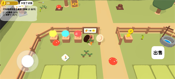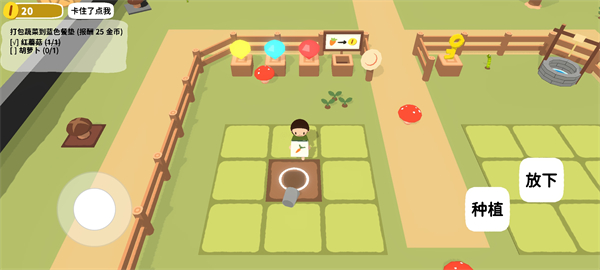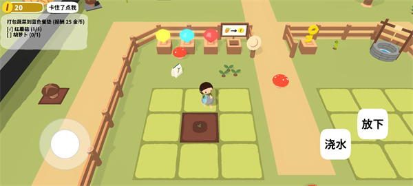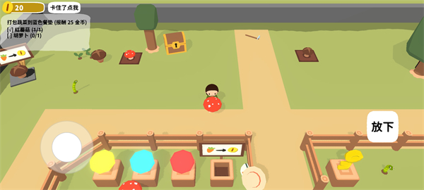 1、进入游戏如图,玩家首先需要根据左上方任务提示,拾取一个红蘑菇到蓝色桌垫上