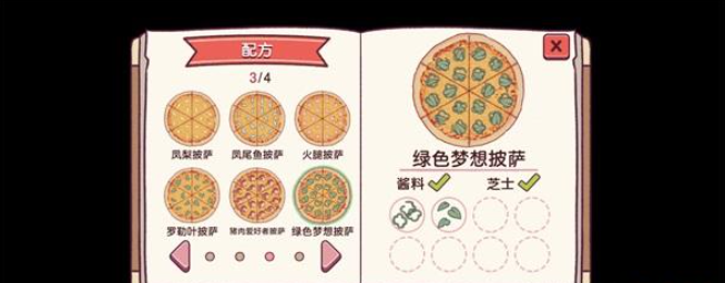 是触发绿色梦想秘方后不久会光临 这个配方我第二次测的时候第二章中后期才有人点了这个披萨 大概两三天内就出现了 他其实是说喜欢绿色食物然后给的提示是升级加速 我刚开始是想说买烤箱加速(加速)之后再购买青椒罗勒叶的助手就会触发(升级)这样就和提示的升级加速一样了嘛 后来才发现是绿色梦想的配方 因为第一次玩的时候青椒助手一直没买过 然后我目前是加速烤箱买了 罗勒叶助手买了 青椒助手没有买 在绿色梦想秘方激活后的几天他就来做客啦