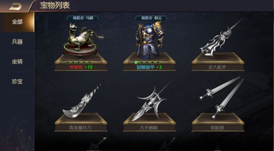 部分红色和橙色武将拥有有自己的专属宝物,部分宝物是百搭款(和任意英雄都可以搭配使用)。宝物类型分别是兵器、坐骑、珍宝,虽然宝物有分类,但最终作用都是为了提升战力。