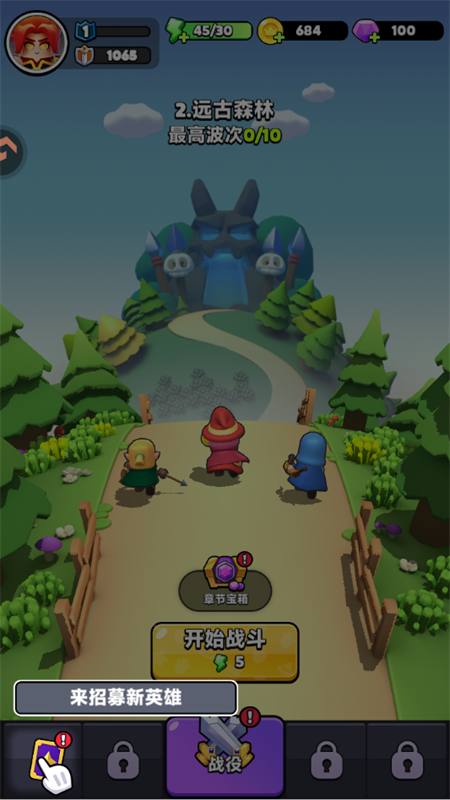 1、打开游戏,我们先进行新英雄的招募操作,点击左下角即可。