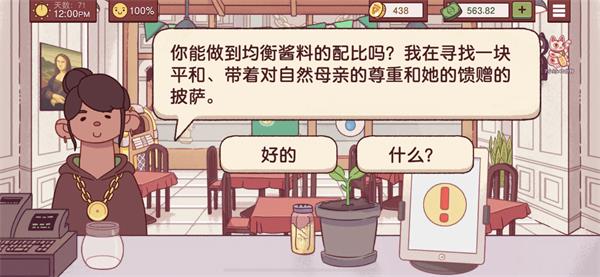 3、有一个粉色头发头上有颗草的姐姐要用特殊礼物换免费披萨。点“是"给她做什么都可以。我做的是酱料+芝士+意大利辣肠。送了一个花盆,可以种出来茄子。