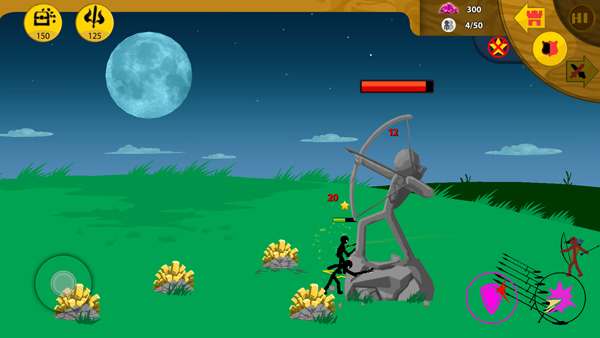 然后等敌人来了后控制矛兵,然后让矿工撤退,让城堡弓兵射,你就顶个盾吸引伤害不让敌人打雕像就行了