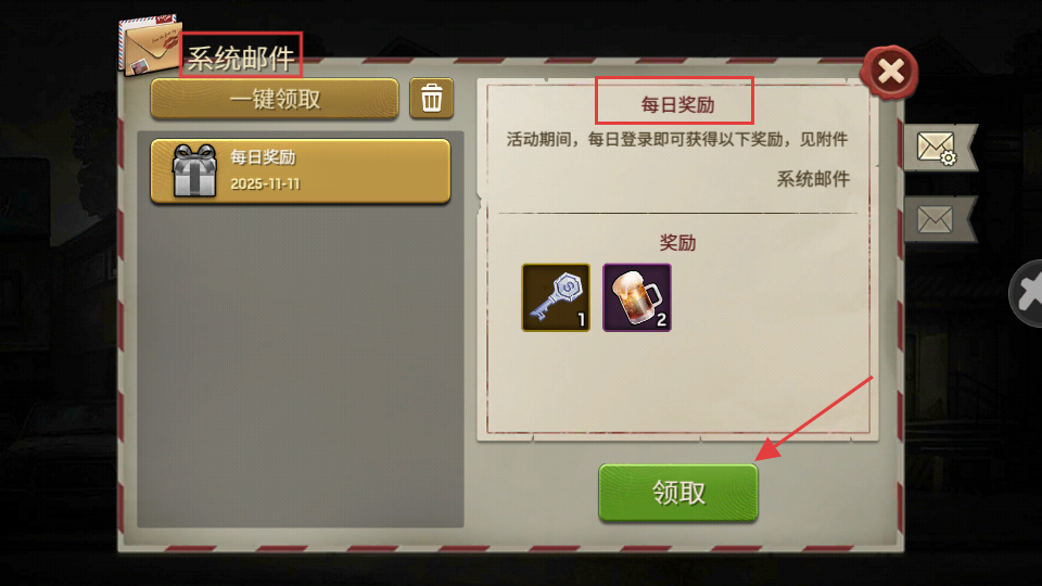 4、打开【系统邮件】,点击【领取】每日奖励,含【钥匙】和【啤酒】。