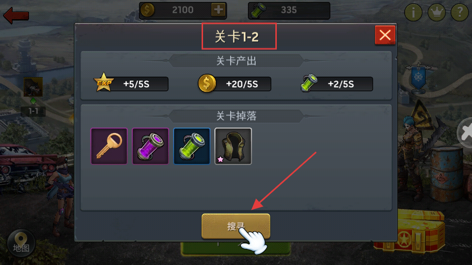 2、进入【关卡1-2】,点击【搜寻】获取产出和掉落物资,提升战力。