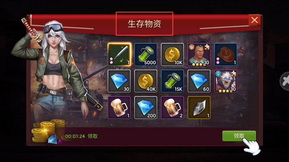 3、在【生存物资】界面,点击【领取】获取各类资源,保障生存。