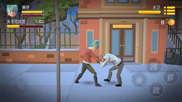 简单的键位设置就是左侧的虚拟摇杆控制方向,右侧则是单独的按钮来打出不同的连招组合,比如踢、拳、抓、跳、防,各项按钮单独放置,这样便于玩家更好的操作,每当成功挑战关卡便可获得橘子,另外进入游戏的左上方是玩家的血量,关卡的完成度以及挑战级别的难易程度。
