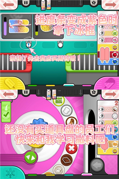 2、攒钱先去商店买闹铃,进度条变成紫色时拿下冰棍