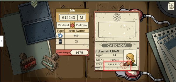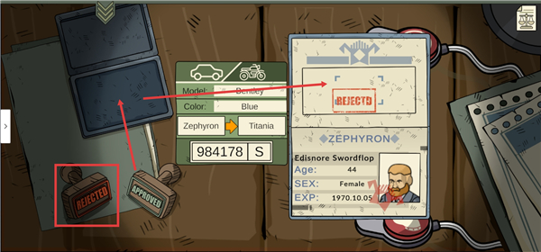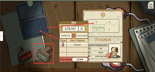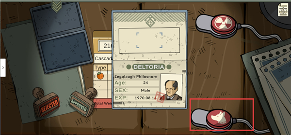 5、因此选择红色印章(REJECTED),先放在印泥中上色,然后盖在通行证上,拒绝他入境。