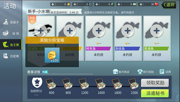 【鱼币获取策略】排名策略:(额外获得鱼币)体力的分配优先双倍的随机鱼种,其次为鱼王稀有鱼。普通鱼、高级鱼种的积分差距比较小,很难拉开距离。