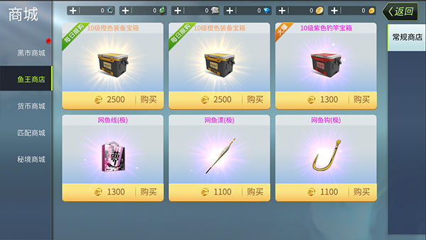 【鱼王商店说明】等级段说明:鱼王商店中会根据自身可装备最大等级的装备来实时刷新可兑换的宝箱。(从9级升级到10级后,鱼王商店会刷新10级的装备)限购说明:每个等级段可兑换的物品是固定的,带有限购标签的商品每日只可兑换1件。未带有限购标签的商品只有有足够的鱼币,可重复购买多次。(限购商品次日会刷新,可再次购买)商品说明:橙色的装备宝箱开启后可以随机获得一件橙色品质的钓竿(米数随机)、钓线、浮漂、钓钩。(一个宝箱获得一个装备)紫色钓竿宝箱开启时获得为一件随机米数的钓竿。(其他指定商品点击icon图标可查看装备属性范围)货币说明:该商店流通的货币仅限于鱼币,没有鱼币不能购买哦。