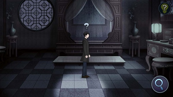 2、当人物头顶有“?”即可点击右下角的放大镜进行互动。