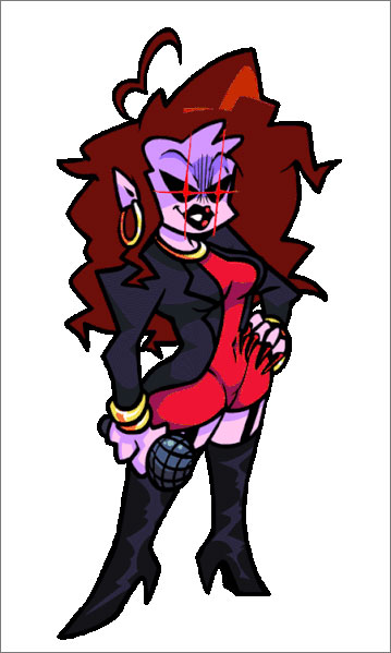 GF是一位气质灵动的红褐色长发少女,身着剪裁利落的红色无袖裙装,脚踩同色系高跟鞋,指尖与唇色呼应统一。她常坐于巨型音响中央,随律动摇摆,双腿轻翘,眼神明亮而坚定,是舞台上最耀眼的节奏灯塔。