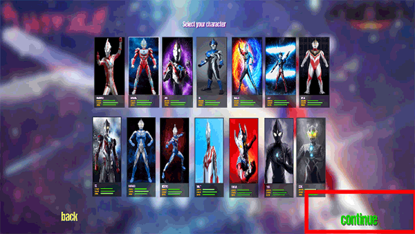 1、启动游戏后,首屏将呈现多位可操作英雄立绘,选定心仪奥特曼(或反派怪兽)后点击“Continue”即刻进入战场;