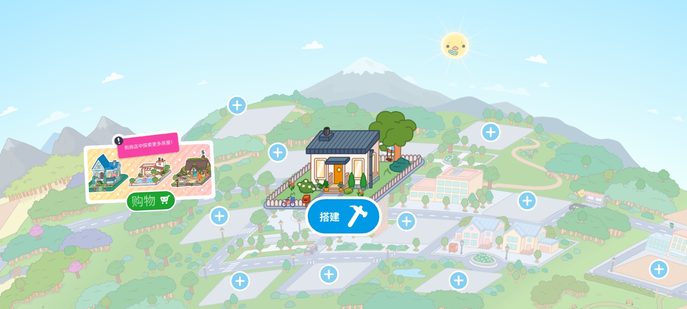 2、点击+号选择一个你喜欢的地方,点击你想搭建的房子,也可以前往商店购买其他房型,搭建完成后点击房子进入内部开始装修。