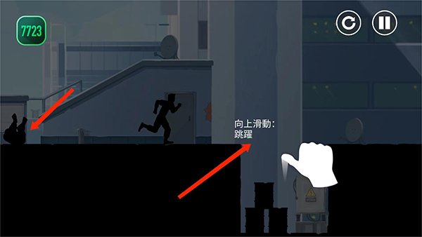 4、向上轻扫屏幕触发腾跃,精准控制起跳时机可跨越断桥、避开悬垂障碍,并有效拉大与追踪者的距离差。