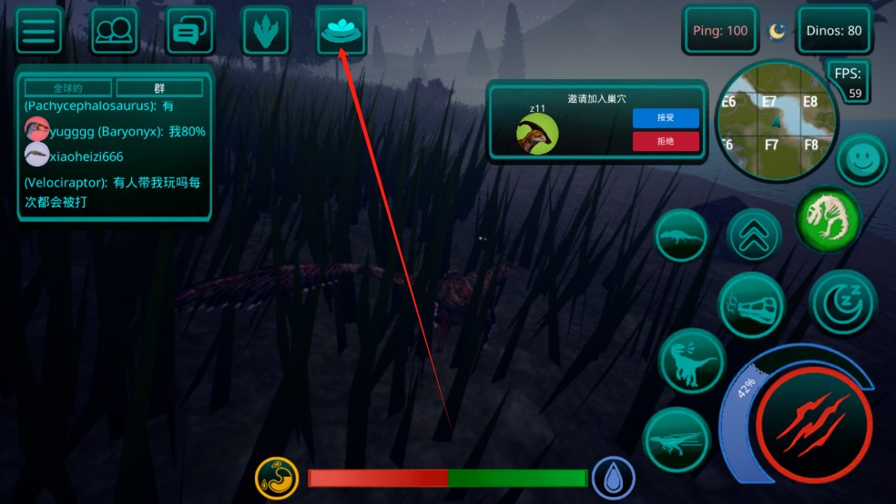 7、你可以建造巢穴,在里面养蛋,然后邀请服务器上的玩家到你的巢穴(家庭),但要做到这一点,你的恐龙必须完全长大并且你的帐户必须达到5级或更高。