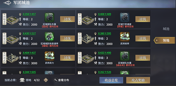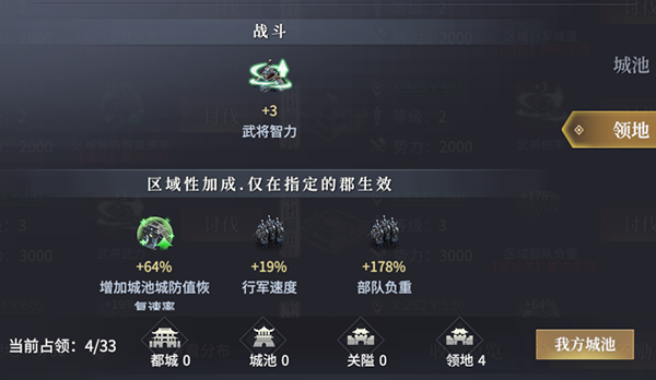【郡域增益城】:在对应郡内,为本军团所有城池及行军部队提供区域性属性加成(如行军速度+15%、守军士气+20%)。