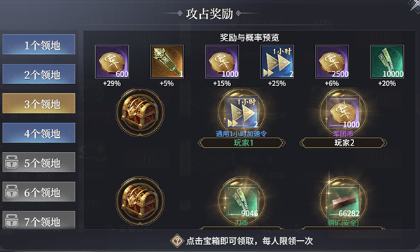 a)不同攻占总量对应不同宝箱组合,每档包含多个可选宝箱;