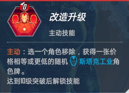 改造升级:主动,零消耗。移除任一角色,随机置换为同价位或更低阶的斯塔克工业角色——隐喻技术迭代的不可逆性。