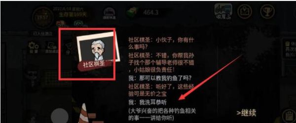 1·首先钓鱼前需要找到社区棋圣,和他进行对话,等待一段时间他就会告诉我们钓鱼的秘诀。