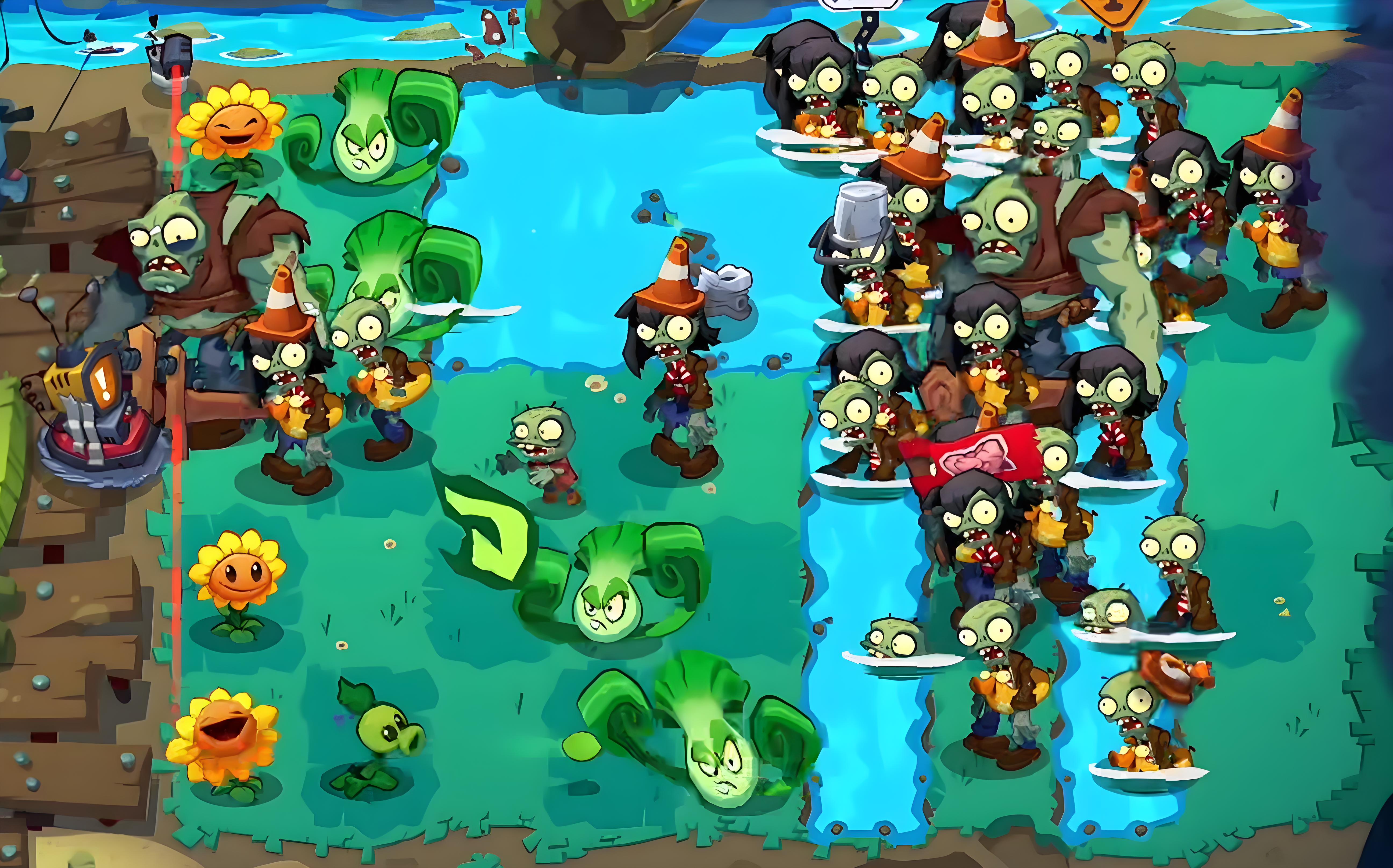 第二关:第十三关 地下幽灵来袭 这次敌人从地下冒出来,打破常规进攻路线。先放向日葵确保阳光充足,接着用豌豆射手稳定输出,水边别忘了布置防御哦。