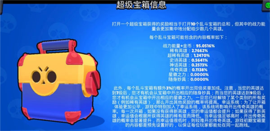 宝箱分为乱斗宝箱、大型宝箱和超级宝箱三种。荒野乱斗腾讯版的宝箱刷新频率比较高,3倍以上的宝箱就已经非常值得购买了,倍数越高代表礼包的东西越多,性价比也就越高。宝箱有几率开出金币、战斗能量、稀有英雄、超稀有英雄、史诗英雄、神话英雄、传奇英雄、星徽之力和随身妙具等等。不同的物品开出概率不同,在不同宝箱中概率也会有所变化。