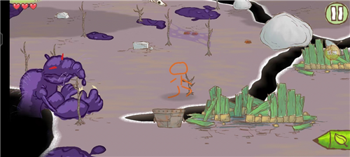 没有固定路径,没有预设道具。你只需在屏幕上任意点击,火柴人便朝目标奔跑;但若前方是腐蚀性紫液洼地?那就切换绿色画笔,在枯树干上快速添几簇叶片——新枝瞬间垂落成桥。陷阱、机关、敌人,全都靠实时手绘化解。操作零门槛,策略却层层递进:画得快不如画得巧,画得准不如画得妙。