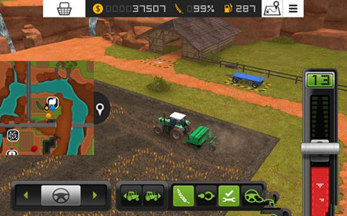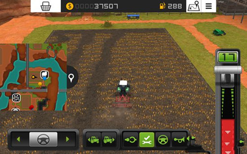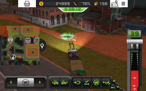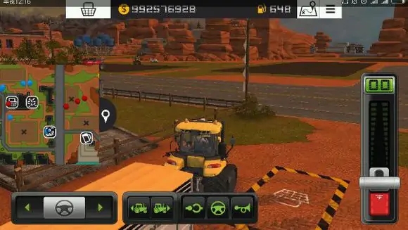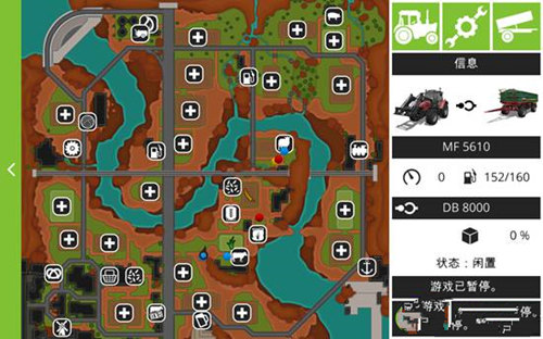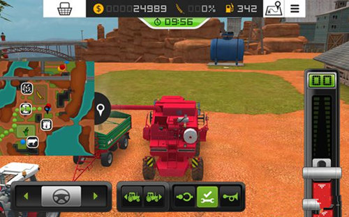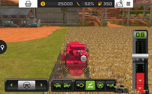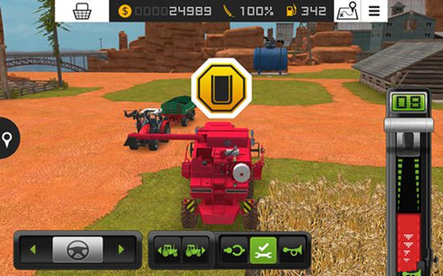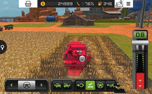 5、点击底部车辆切换键(左右箭头),快速在收割机/拖拉机/运输车间轮换;小地图虚线导航直达粮仓,沿途设有补给站与维修点。