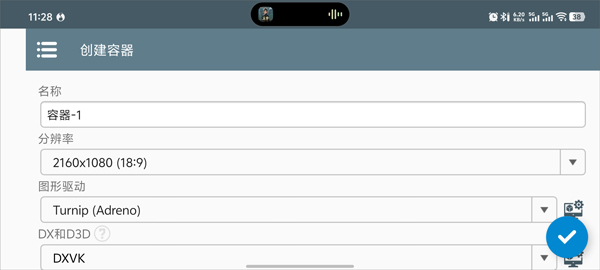2、在容器配置页中,依据手机实际性能选择适宜的分辨率与显存分配(低配机型推荐720p+512MB显存组合,兼顾流畅性与画质);
