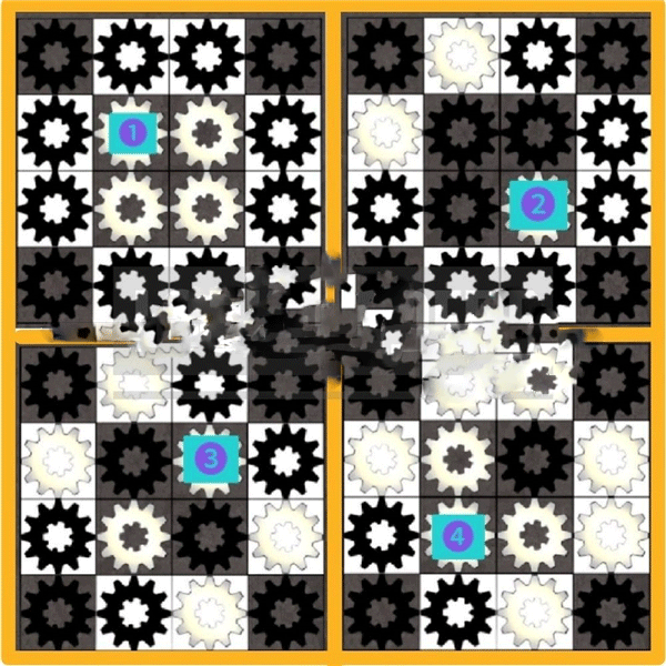 ② 齿轮机关解法:按编号顺序点击对应位置(黑底为默认态,白底为激活态),每次点击将翻转自身及上下左右邻格状态