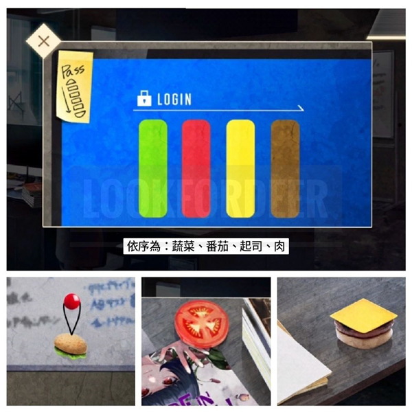 ② 解析办公桌「汉堡」食材层叠顺序:蔬菜→番茄→起司→肉 → 对应屏幕色块序列「绿→红→黄→褐」