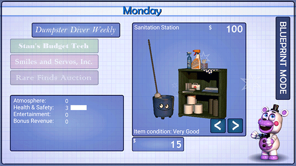 通过闭路监视器来观察玩具熊们的活动路线,控制更多的音乐和来限制玩具熊的活动。