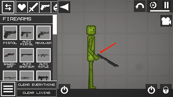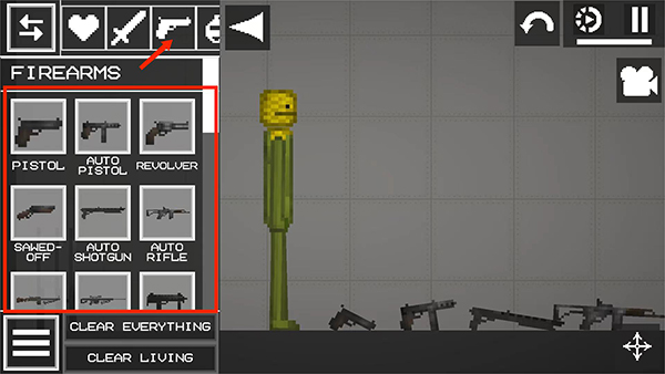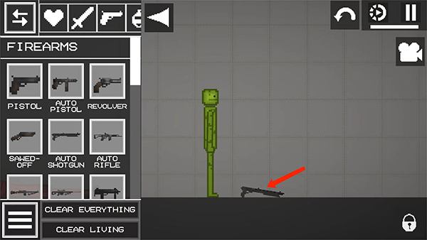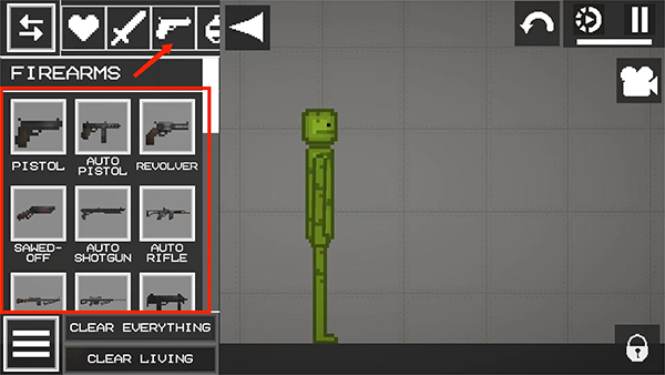 3、切换至【手枪】分类,选取一把武器拖至西瓜人脚边,