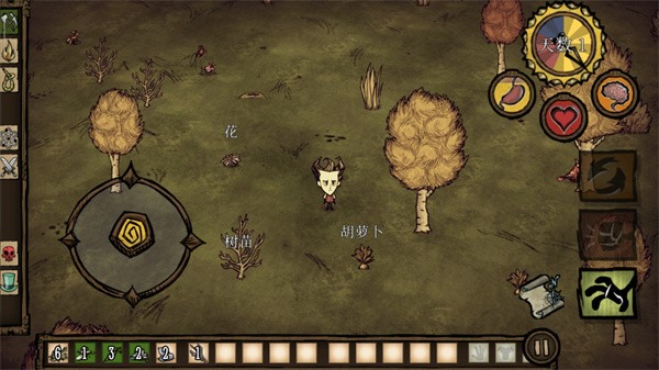 6、游戏就正式开始了,左边是控制角色方向的,右边是收集的,玩家需要收集一切能被利用的资源来躲避饥荒;