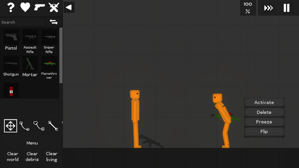 游戏中内置海量可交互物件,涵盖建筑组件、生活道具、动力装置等多类模块,支持无限制自由组合。武器系统尤为丰富:从精准点射的手枪、连发压制的步枪,到持续灼烧的喷火器、范围爆破的炸弹,每种装备都具备独立物理反馈。你可为角色装配武器并激活AI对抗逻辑,观察它们在重力、碰撞与惯性作用下展开“自主战斗”,过程充满不可预测的戏剧张力。
