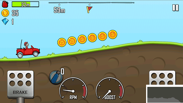 2、玩法非常简单,玩家需要控制赛车在崎岖的路面上行驶,左边按钮控制刹车,右边按钮控制油门;