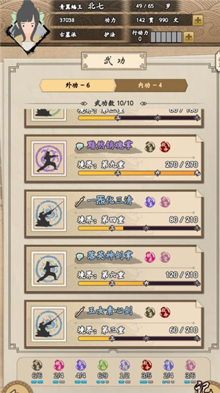 8、高级武学带来的属性加成呈指数增长,尤其内功与身法类,每级稳定提升10+点基础属性;而基础锻炼收益随时间锐减,后期几乎可忽略。