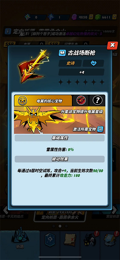 UP池策略:全力冲刺「电翼龙」限定卡池。定向选择务必锁定【古战场断枪】——这是召唤电翼龙的唯一核心凭证;另一选项为技能类道具,非必需。若预算有限,建议抽至获得该武器即停手;若欧气爆发,顺带拿下配套技能亦属锦上添花。通常2–3日即可稳稳入手,无需等待后续卡池——下一期火系UR龙同样依赖此枪作为召唤钥匙,绕不开也等不起。