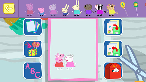4、轻触左侧角色图标,拖拽佩奇、乔治或小羊苏西到卡纸上,支持缩放与旋转调整位置。
