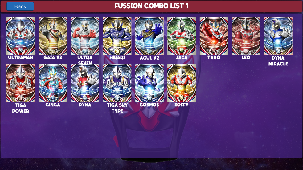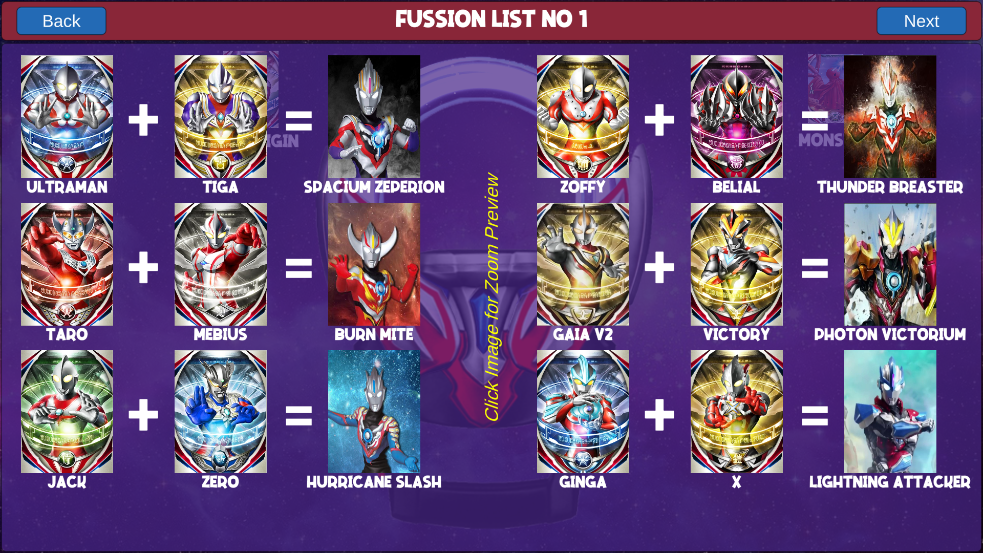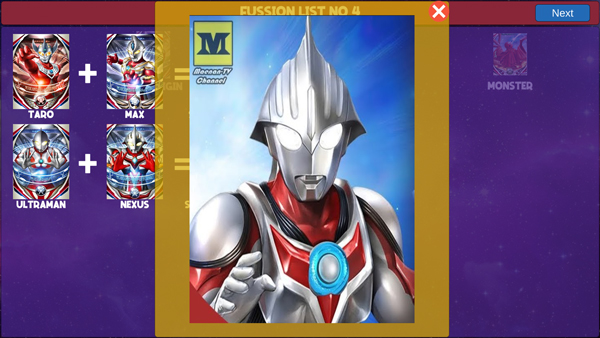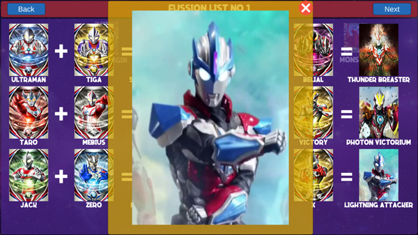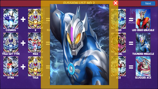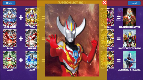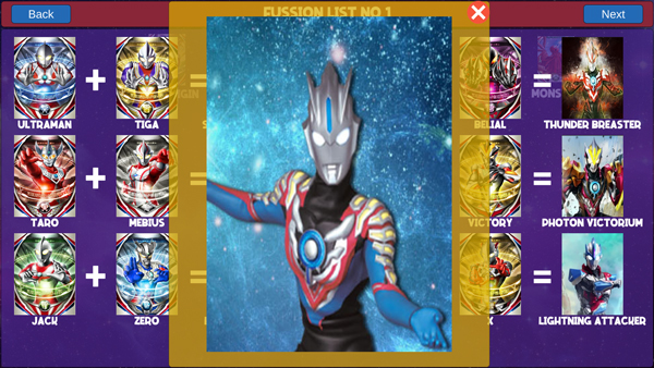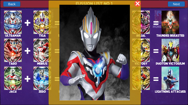该模式提供丰富且结构化的融合图谱,所有组合均按逻辑归类,玩家可滑动浏览多页融合方案,直观掌握哪些奥特战士能协同激发新形态。