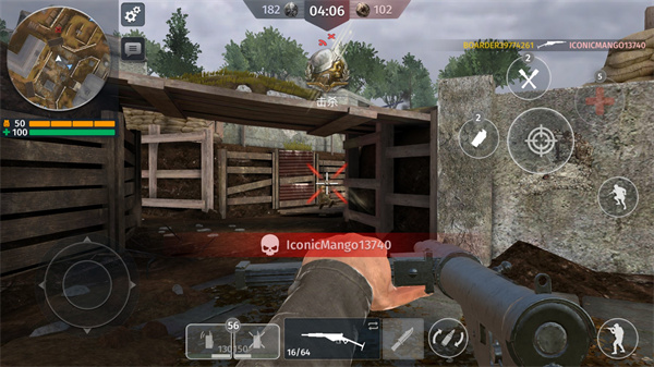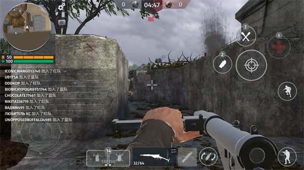 3、虚拟摇杆控制移动方向,右侧功能区集成开镜瞄准、战术翻滚、投掷物切换、小队指令呼出等快捷操作;