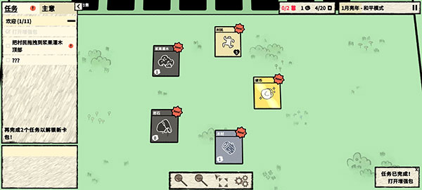 4、首轮通常获得木材、浆果灌木、村民、岩石与硬币五张基础卡。按任务指引将其拖至主区域,完成首次堆叠。