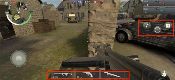 4、屏幕底部为武器切换栏,右侧集成投掷物(手榴弹/烟雾弹)与医疗资源(急救包/止血带),合理规划使用时机是扭转战局的关键