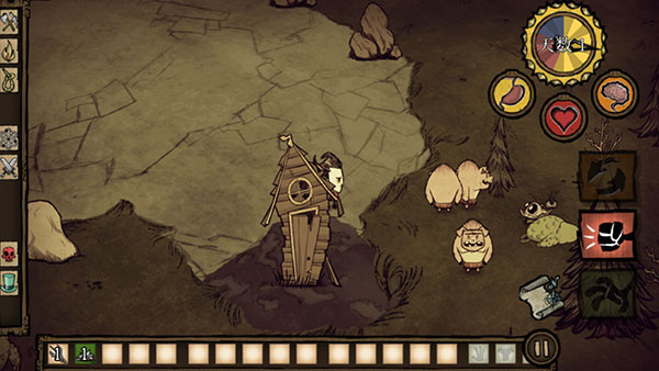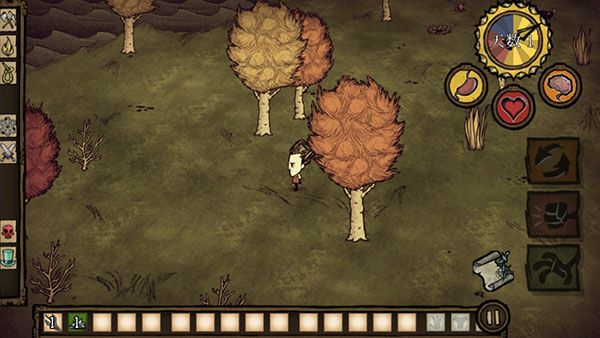 6、游戏就正式开始了,左边是控制角色方向的,右边是收集的,玩家需要收集一切能被利用的资源来躲避饥荒;
