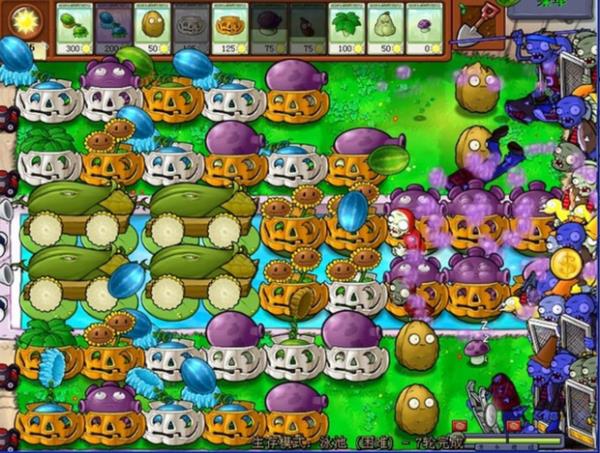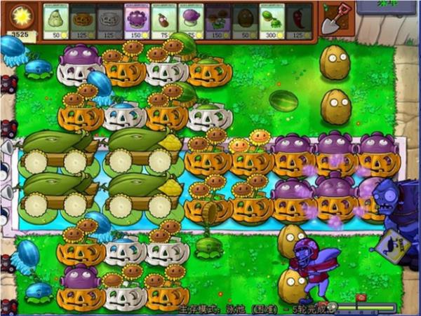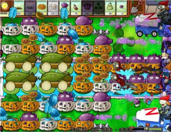 面对携带幼崽的巨型僵尸,防御体系需主动升级:从第二、三列起全线加装南瓜罩,尤其要为即将登场的复制者预留部署位;幼崽单位交由后排忧郁菇群体压制,避免浪费高成本道具。此时应严控阳光支出——倭瓜比樱桃炸弹更具性价比,且西瓜投手的持续输出能力远超预期,无需过度依赖一次性清场手段(如下图所示):