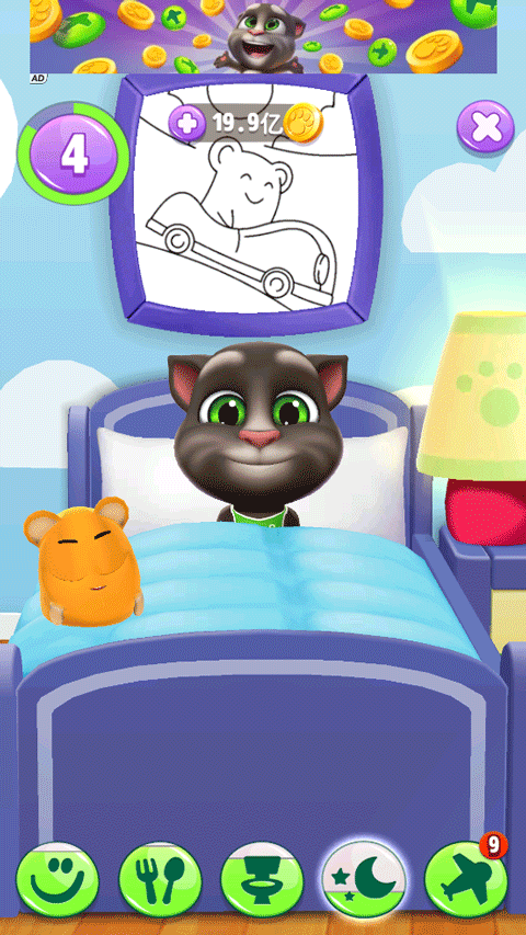 4、随着汤姆猫的疲劳值增长,它会想要睡觉,点击卧室的床再点击台灯,汤姆猫会进入睡眠状态并且恢复疲劳值。