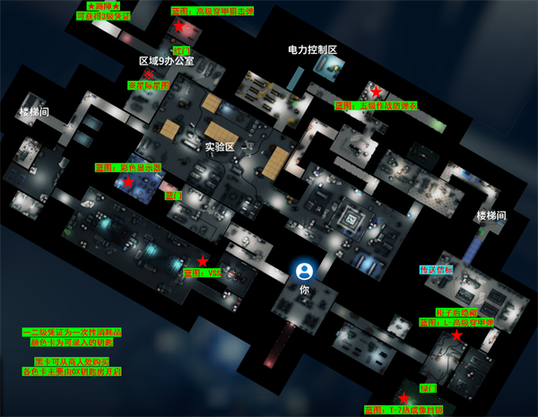 ※※前往实验室:办公楼B1层设有隐蔽电梯井,消耗1张一级通行卡即可进入。另可通过加油站—隐藏矿场路线稳定刷取,或完成技术中心小明的【复制通行证】任务后,在主基地直接购得。