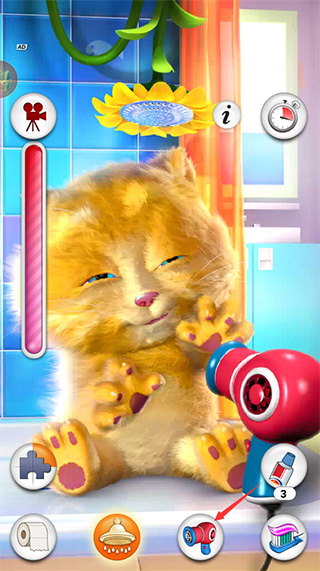 4、清洗完毕后,点击吹风机图标并左右拖拽,即可模拟吹干全过程,金杰会边抖毛边发出满足的呼噜声。
